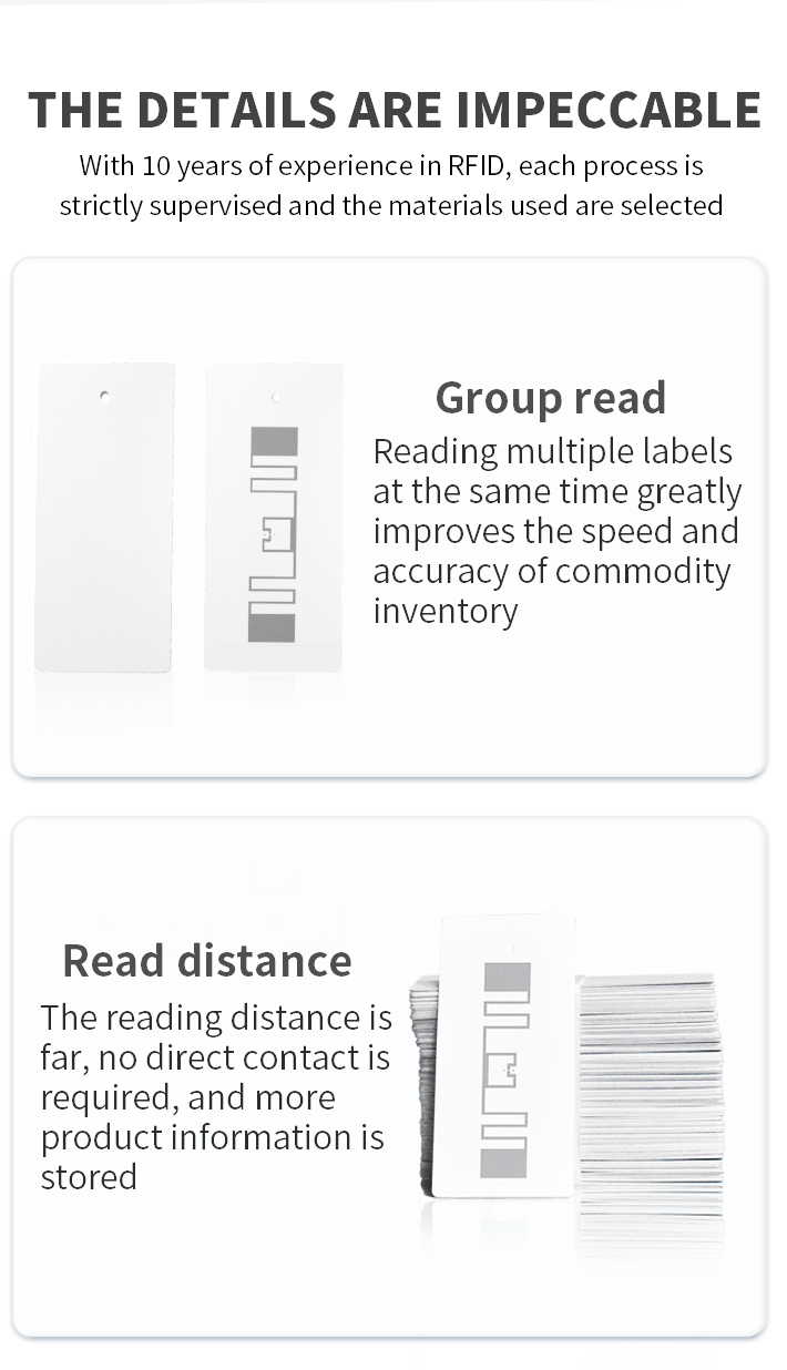 What can RFID UHF tags help you solve?1. RFID tags for rapid retail inventory management of clothing2. RFID clothing tags for quick checkout3. RFID clothing tag with anti counterfeiting function4. RFID clothing tags for warehouse management5. RFID technology inventory to avoid out of stock code6. Anti theft RFID clothing tag7. Quick cash register RFID tag8. RFID tags for quick inventory9. RFID tags can be used in industries with all warehousing functions10. Application: retail, manufacturing, clothing, logistics, e-commerce, auto parts and other industries