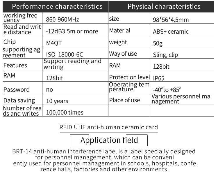 RFID Anti-human ceramic card parameters: